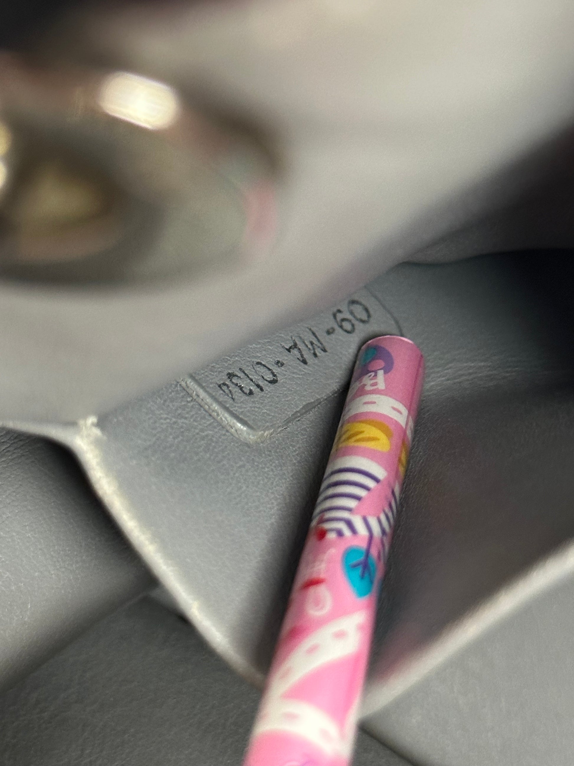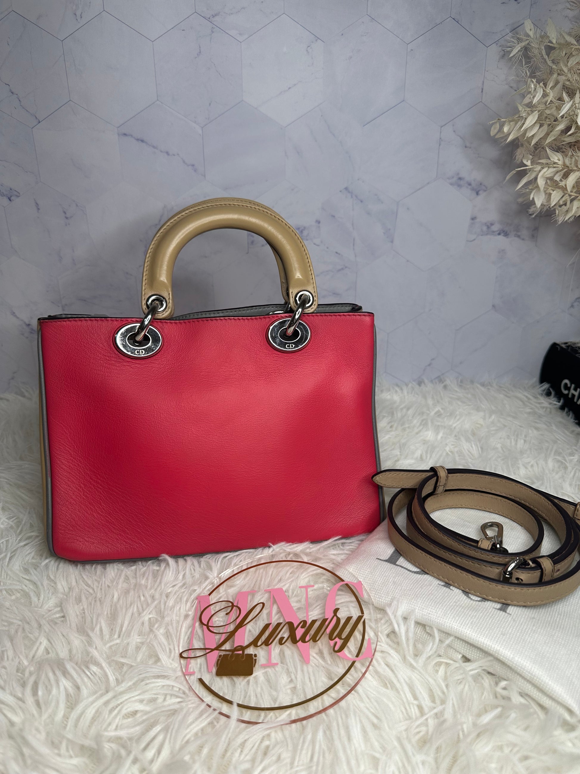 Leather is beautiful and soft with two-tone beige / fuchsia colour. No scratches on leather. Light rubs on corners. Inside is clean. Inside corner has small glazing crack but doesn’t affect the use of the bag.