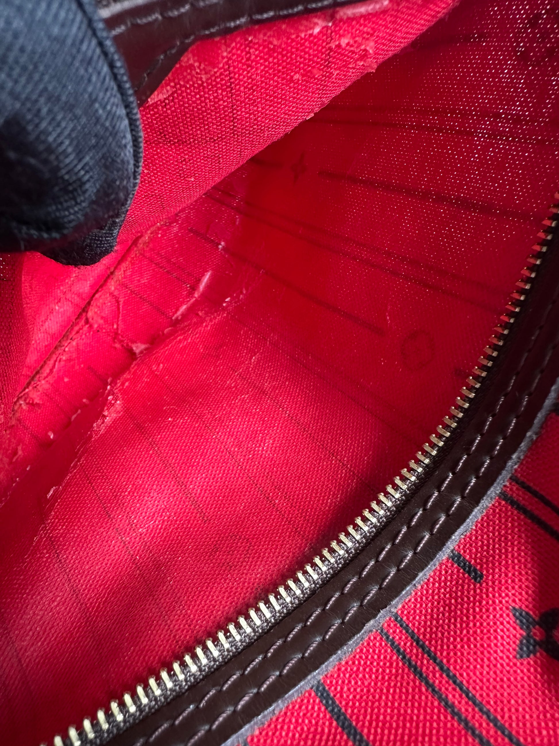 Inside has very small stain but overall still clean. Inside pocket has peeling but doesn’t affect the use of the bag. No smell.